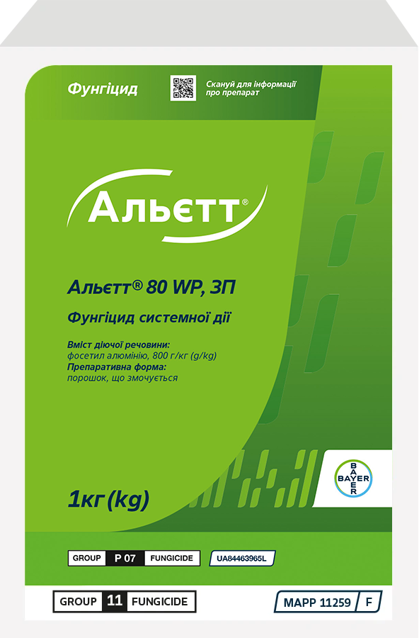 Альєтт® 80 WG, ВГ - системний фунгіцид захисної дії. Швидко проникає в середину рослини і переміщується з нисхідним та висхідним рухом. Впливає на проростання грибних спор і блокує подальше розповсюдження хвороби. Препарат також посилює захисні властивості рослин проти проникнення інфекції всередину.