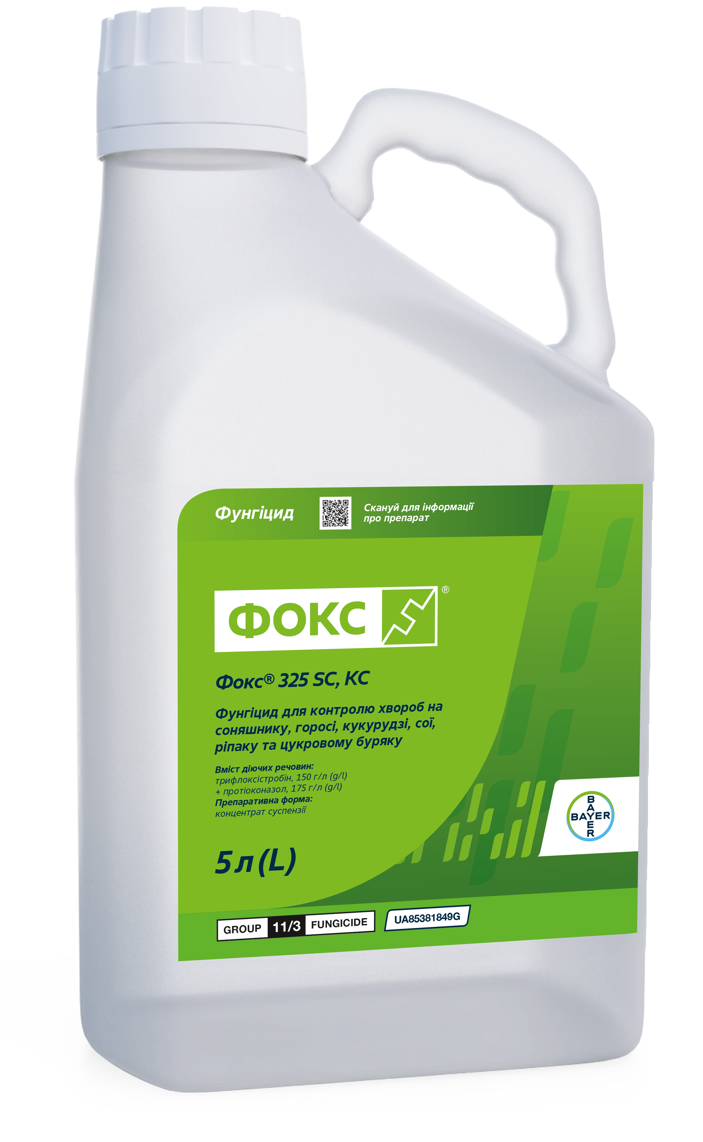 Фокс® 325 CS - новий високоефективний фунгіцид для захисту соняшнику, гороху та сої від широкого спектру хвороб. Препарат №1 у системі захисту сої в Бразилії. Завдяки мезостемній дії трифлоксістробіну відбувається тривалий захист оброблених частин рослин, а газова фаза продукту створює додаткову профілактику захворювань не оброблених частин рослин. Виражена системна дія протіоконазолу забезпечує тривалий захист як оброблених тканин рослини, так і молодого приросту. Трифлоксістробін, який знаходиться на листовій поверхні - запобігає проникненню патогенів до неї, а протіоконазол, який транслокується у тканину рослин, контролює розвиток міцелію і проникнення гаусторій. Фокс® затримує старіння рослини шляхом впливу на баланс гормонів, поліпшує фотосинтез та оптимізує азотний обмін у рослині, як результат — збільшується виповненість насіння й маса тисячі насінин.